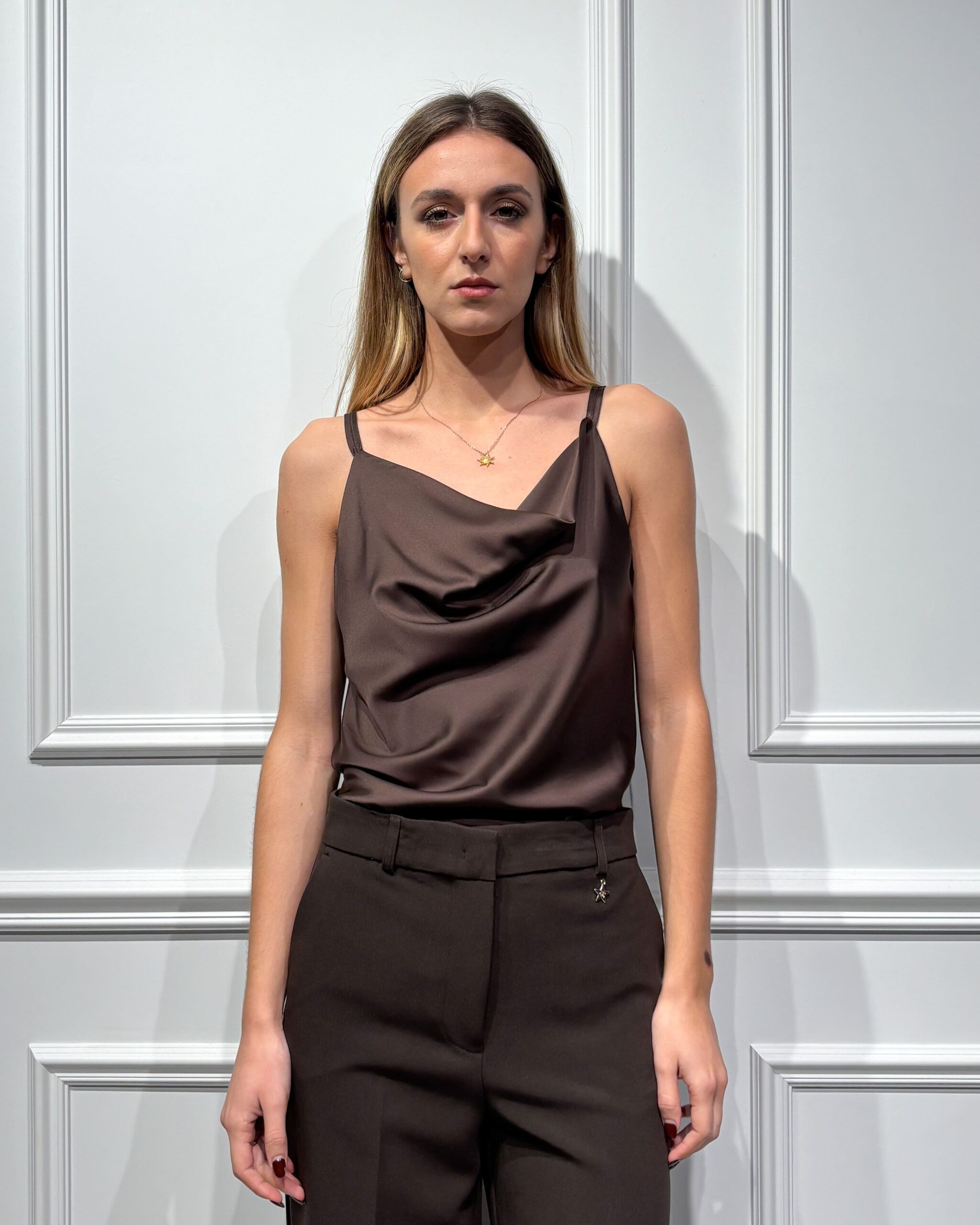 Il top della collezione autunno/inverno di Imperial è caratterizzato dallo scollo a gronda anteriore, spalline sottili doppie e scollo a V posteriore. Lunghezza regolare al fianco.