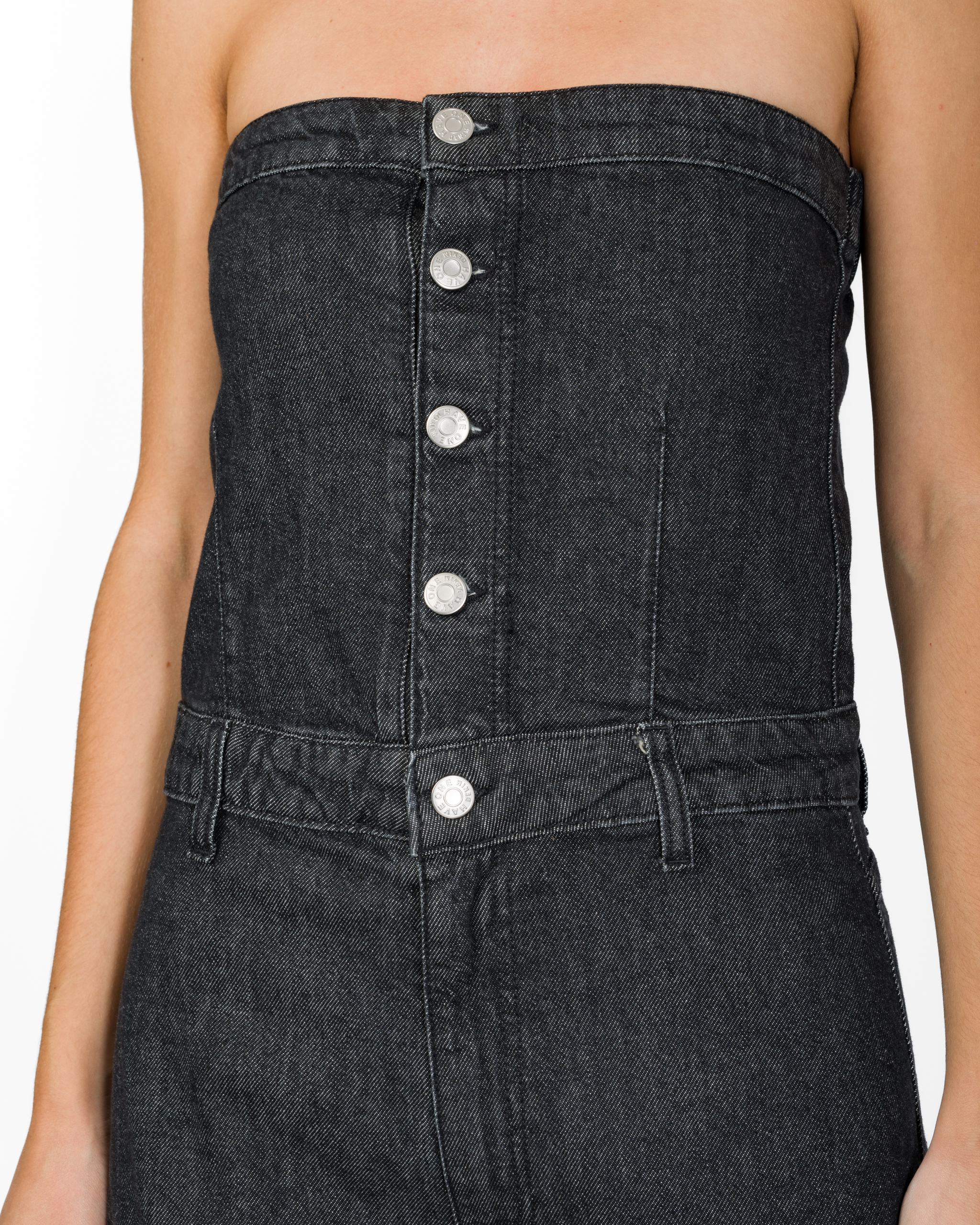 La tuta lunga della collezione autunno/inverno di Haveone è caratterizzata da un design a fascia pulito e contemporaneo, realizzato in denim scuro. Il corpino senza spalline presenta una fila di bottoni metallici a vista che ne definisce la linea, mentre il punto vita sagomato introduce il pantalone a gamba dritta con maxi tasche cargo laterali.